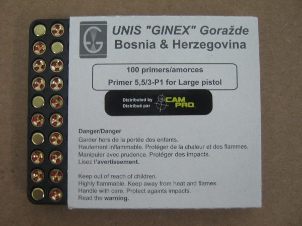 UNIS GINEX primers offer consistency that matches other premium primers on the market at a fraction of the cost. A manufacturer of ammo components – as well as blasting caps and electric igniters – since 1951, this Bosnia-Herzegovina–based company knows a thing or two about turning a spark into a bang. Primers from UNIS GINEX are available with standard SINOXIDE priming mixture charges, as well as EKO priming mixture that’s formulated to be free of heavy metals. Whether you’re assembling match-grade ammo for your pistol, or mass-producing rounds for a family trip to the shooting range, these primers are sure to perform. Each UNIS GINEX Large pistol primer is manufactured to meet high-standards and is designed to be easy to install. Formulated to be temperature insensitive, you can count on them whether the conditions are sub-zero or scorching-hot. UNIS GINEX makes primers for a wide range of rounds, from the smallest calibers to the biggest rounds commercially available. A history of excellence, a high-tech priming mixture, and costs that undercut the competition make primers from UNIS GINEX a must-have component on your reloading supplies shelf. Available in 100 pce Sleeves & 1000 count boxes. For most handgun cartridges requiring a Large pistol primer. Primers are only shipped by Canpar Courier, Canpar does not deliver to PO Boxes. Please DO NOT use Canada Post as your shipping method if your order contains this item.Campro/UNIS Ginex Large Pistol Primers 1000/Box