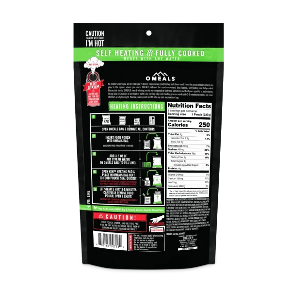 A great meal to have camping, at the range when you get hungry or out in the bush shooting or hunting. OMEALS are the innovative, cook-in-pouch meals designed to make your food preparation easy while camping, boating, hiking, or anywhere out and about – without compromising on taste! They’re also the number one choice for government relief agencies and humanitarian groups around the world. OMEALS are produced using the highest quality ingredients, patented packaging systems, and lightweight materials so you can throw them in your gear and forget about them until you’re ready for a hot meal at the end of a tiring day. Just add water to the pouch along with the enclosed meal and flameless heater, seal the bag, and give it 3 to 5 minutes to steam. Voilà! Your delicious meal is ready to serve, no matter where you are. This vegetarian pasta in savory tomato sauce gets its wholesomeness from kidney beans, kale, soy protein crumble and Parmesan cheese. Perfect for those moments when you need a quick bite that warmly satiates hunger. Shelf Life: All our products have a best by date of 5 years from date of manufacture, we guarantee freshness. Store in a cool dry place OMEALS® is powered by NXH® Heating Technology. Tested and certified non-toxic, odorless and safe to use in confined spaces.Pasta Fagioli