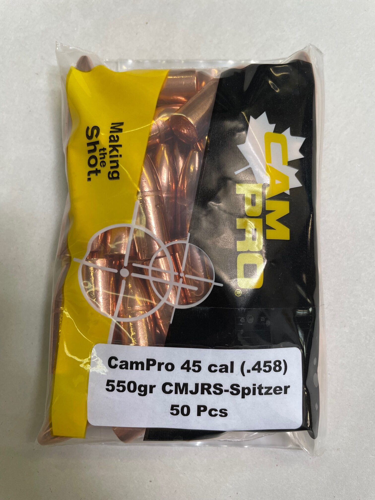 CAMPRO bullets offer one of the highest quality and value on the market. You now have the opportunity to use the same quality during competitions and while you practice. Fully copper-plated and featuring a swaged lead core, each bullet is carefully reformed at the end of the process. Experience an ultra-precise shot—bullet after bullet. This bullet is suitable in a single shot 45cal rifle. NOT SUITABLE FOR TUBE FED RIFLES! These bullets have a plating that is thicker than most other Manufacturer's bullet plating. Approx .08'' in thick. Weight (grain): 450gr Sectional Density: .238 Cannelure: Yes Diameter (in) .458 Copper thickness (in): .008 This is NOT LOADED Ammunition.CamPro 45cal (.458) 500gr RS-Spitzer Bullet 50/Bag