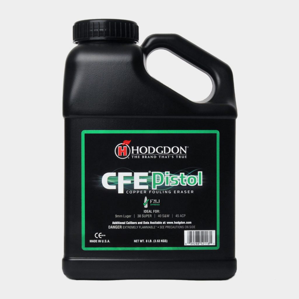 Hodgdon CFE Pistol is a spherical powder that was originally developed for US military application. This excellent pistol propellant utilizes the Hodgdon CFE formula, Copper Fouling Eraser, virtually eliminating copper fouling, plus providing top velocities with clean burning and minimal muzzle flash. For competitive shooters and hand loaders seeking the perfect powder for target or self-defense loads, CFE Pistol provides optimum performance in cartridges like the 9mm Luger, 38 Super, 40 S&W, the venerable 45 ACP and many more.