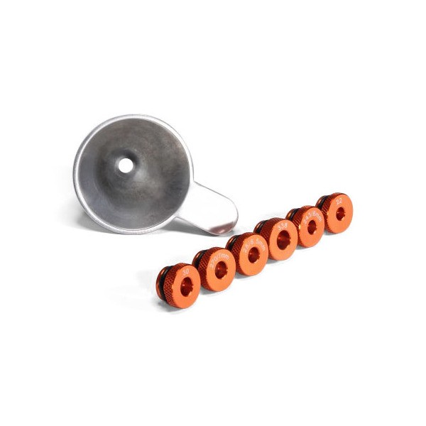 Lyman’s Precision Funnel Set is the “Perfect” system for the serious reloader. The Brass Smith Precision Funnel Set is made to be completely static free, no more powder clinging to surfaces which can happen with lightweight plastic funnels. The solid construction and quality of the Brass Smith Precision Funnel Set will be apparent in its first use. This is no “one size fits all” funnel, the Brass Smith Precision Funnel Set uses precision machined, caliber specific inserts to properly fit the case neck. The inserts can be quickly and easily installed by simply pushing them into place and then pulling them out when changing calibers. The Brass Smith Precision Funnel Set also comes with a padded storage case that neatly stores extra inserts when not in use. The funnel comes with inserts for 22, 243/6mm, 25/6.5mm, 270/7mm, 30 and 338 caliber rifle cartridges.
