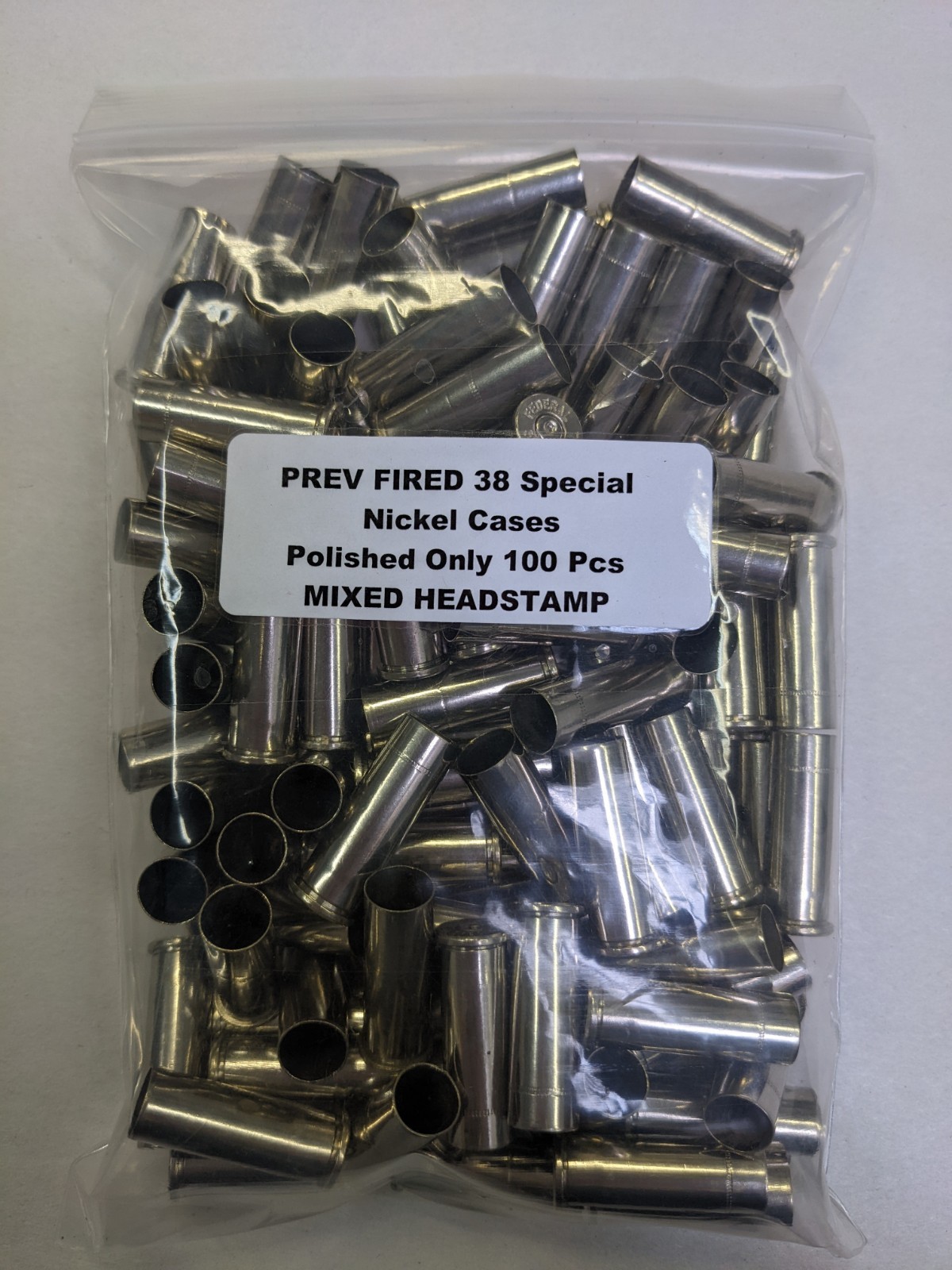 These are all Prev Fired Mixed Headstamp all Nickel 38 Special brass casings. Casings has been Tumbled & Polished.